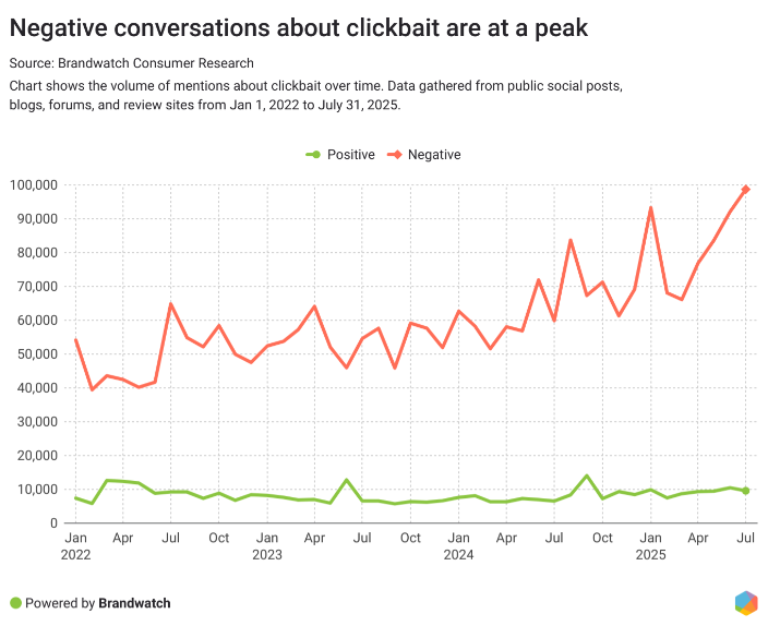 54 % des conversations relatives à la publicité expriment de la colère. Une frustration alimentée par le clickbait (90 % de mentions négatives sur ce sujet précis), la surabondance de publicités, y compris chez les internautes ayant adhérés à des abonnements premium.