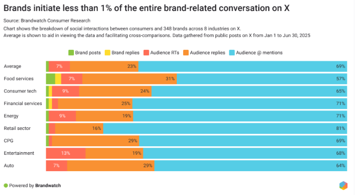 Le rapport met en lumière le manque de pro-activité des annonceurs : sur X, les marques initient moins de 1 % des conversations en ligne les concernant, et interviennent rarement dans les 99 % restants.