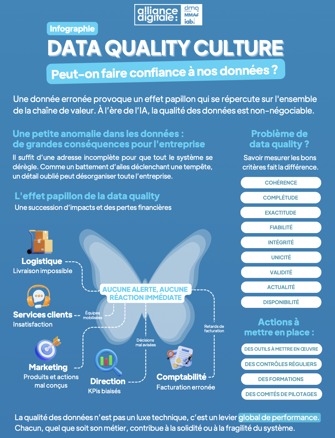 Pour aider les acteurs du marketing et de la communication à mieux comprendre à quel point la qualité des données est devenue un enjeu central pour toutes les entreprises, Alliance Digitale vient de publier l’infographie « Data Quality Culture » (en pdf) qui a été élaborée par le Groupe de Travail Data Quality.