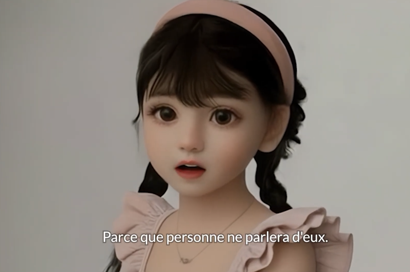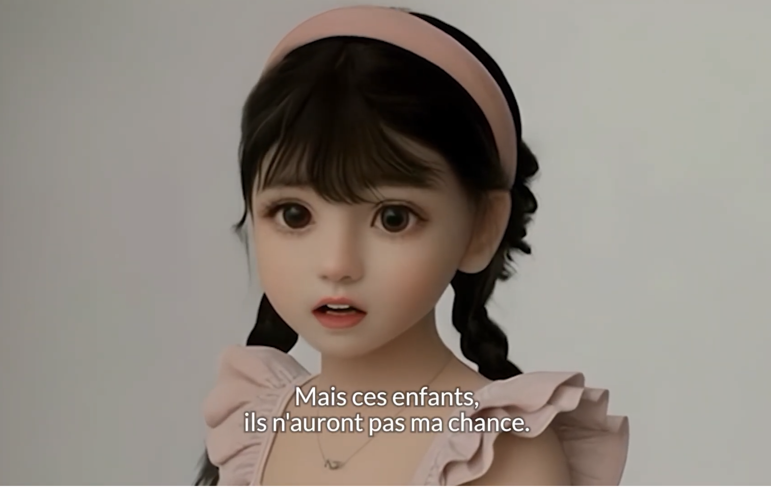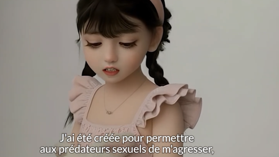 Le texte de la campagne de l’Iscom : « J’ai été créée pour permettre aux prédateurs sexuels de m’agresser, dit-elle, «en attendant de passer un jour à l’acte sur de vrais enfants. Mais ces enfants, ils n’auront pas ma chance parce que personne ne parlera d’eux ». Avec ce carton de fin : Refusons de banaliser l’inacceptable. Agissons pour protéger les enfants.