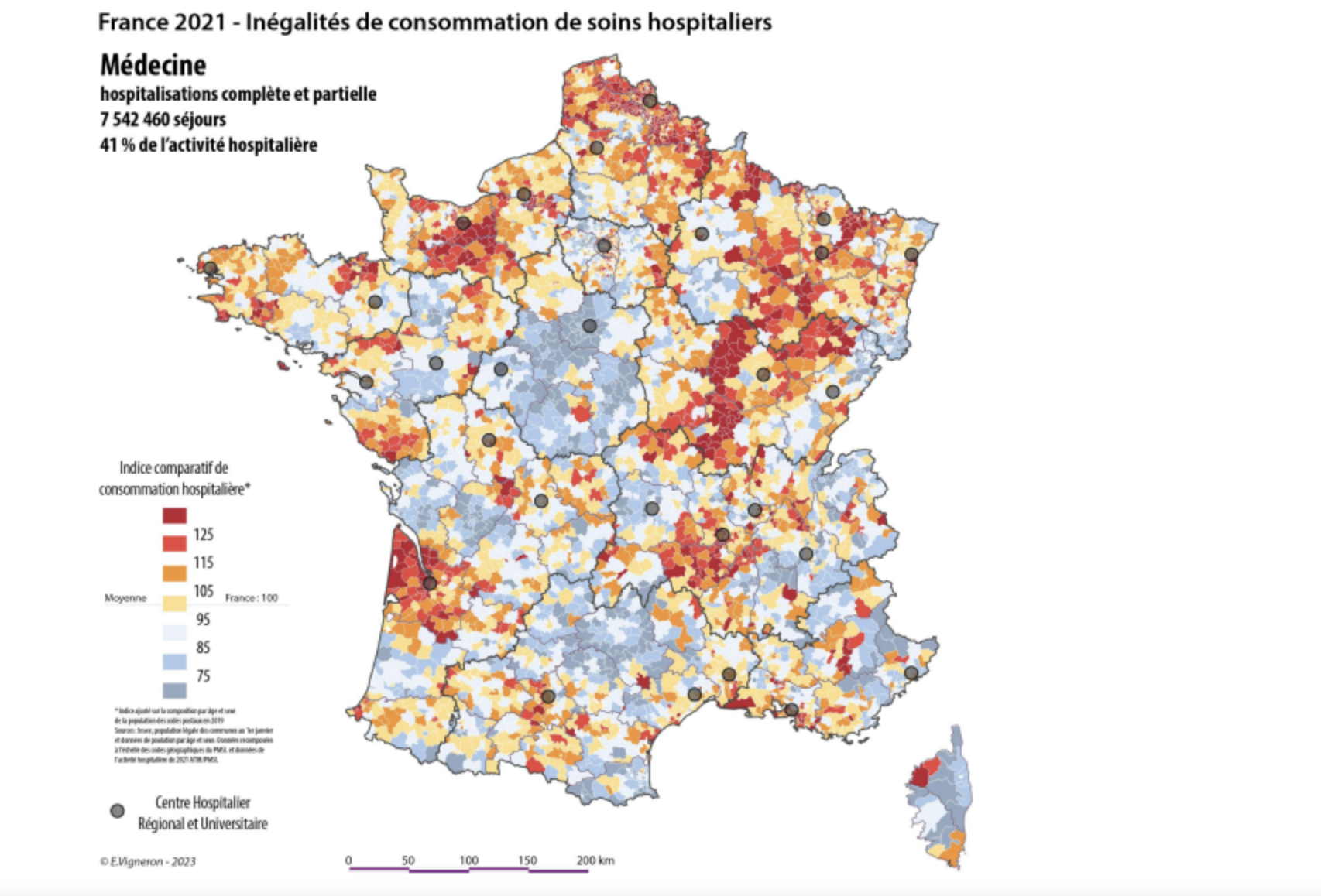 L’accès aux soins hospitaliers, notamment en psychiatrie, sont très inégalement répartis sur le territoire. Les zones rurales sont particulièrement mal servies sur ce plan, comme le montre cette carte :