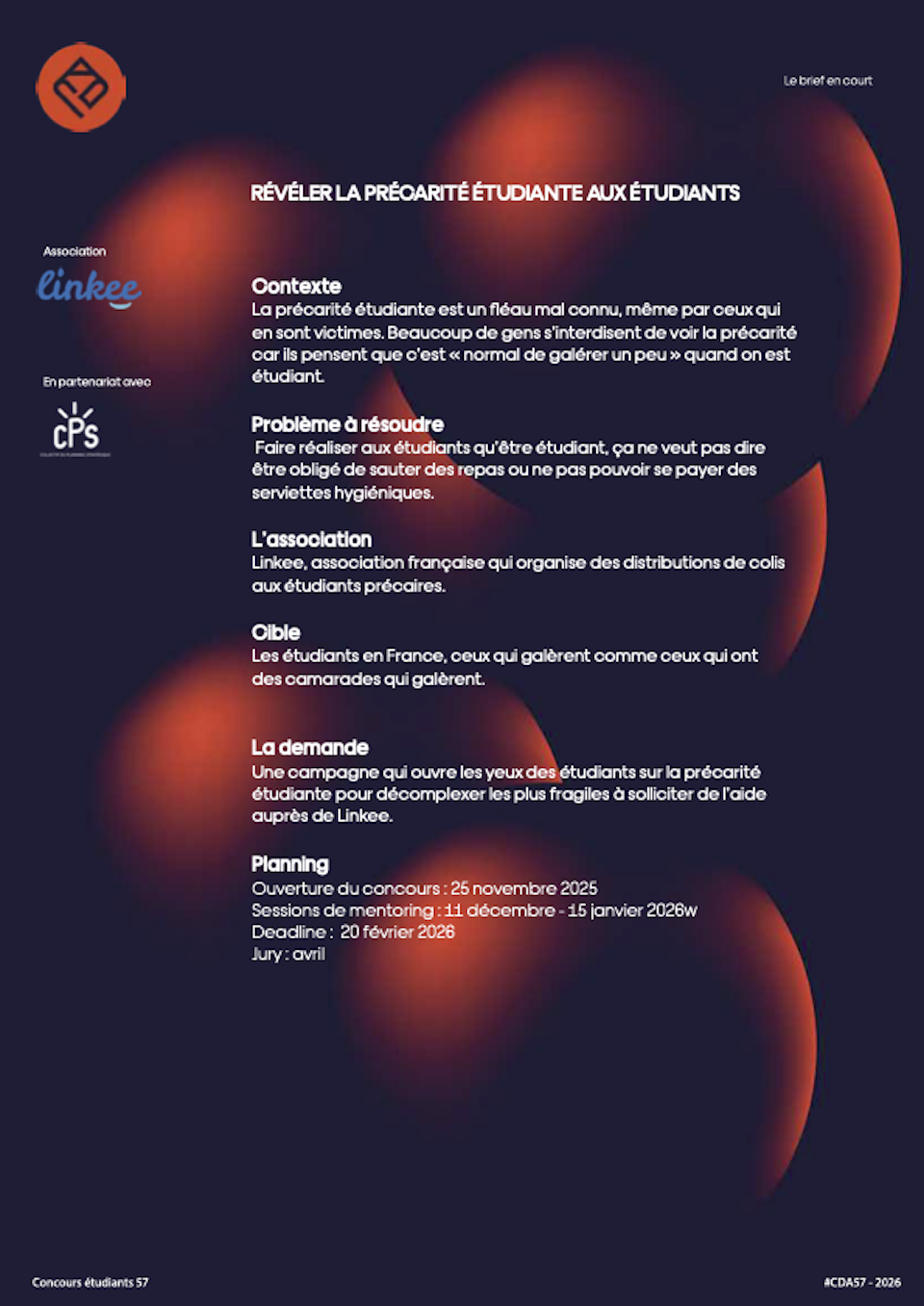 Cette réalité est au cœur du concours 2026 du Club des D.A., qui demande aux étudiants en création d’imaginer une campagne sur la précarité étudiante pour le compte de Linkee, une structure d’aide alimentaire pour étudiants en situation de précarité.