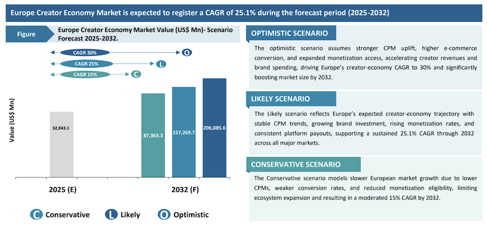 Valorisé à 8,14 milliards $ en 2025 (soit +19 % par rapport à 2024), le marché français pourrait atteindre 38,59 milliards en 2032. Le pays compte déjà 348 058 créateurs monétisés (contre 303 648 l’an dernier) et ce total pourrait dépasser 1,47 million d’ici 2032.