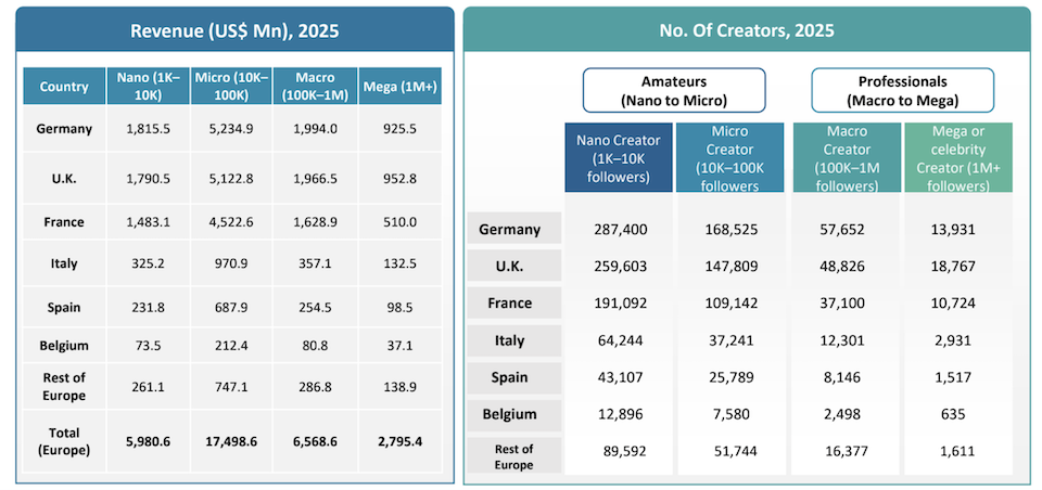 Les nano-créateurs (1 000 à 10 000 abonnés) pèsent 8,2 milliards $ et forment le segment le plus vaste, avec plus de 6,3 millions de créateurs monétisés en Europe. Leur nombre pourrait d’ailleurs dépasser 20 millions d’ici 2032 .