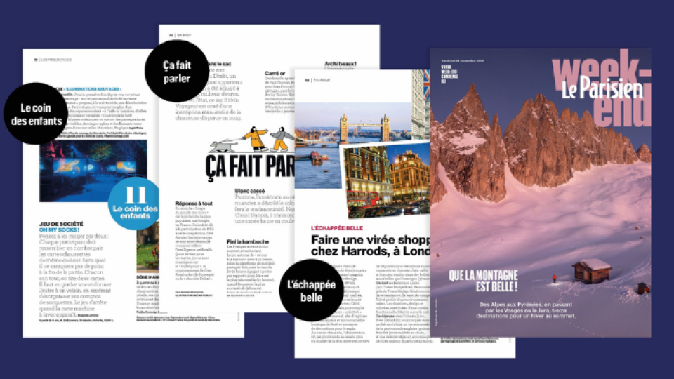 Avec « Échappée belle », Le Parisien Week-End adresse les acteurs du tourisme et des loisirs. La rubrique met en avant des courts séjours expérientiels, en France et en Europe, mêlant événements et découverte des territoires.