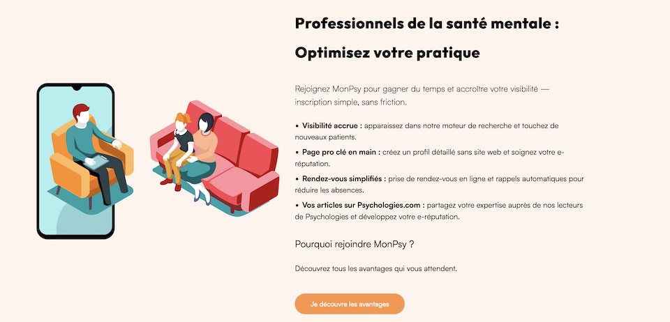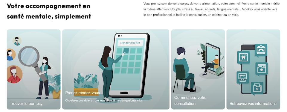 La plateforme se branche aussi sur l’actualité publique : MonPsy s’inscrit dans le cadre de « Mon soutien psy », le dispositif de l’Assurance Maladie lancé en 2022 pour faciliter l’accès aux soins psychologiques.