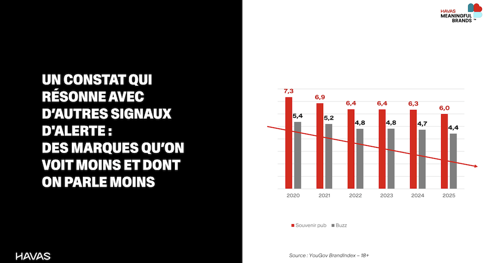 Un constat qui s’exprime par une baisse continue du souvenir publicitaire et du buzz, deux indicateurs clés du lien émotionnel entre les consommateurs et les marques.