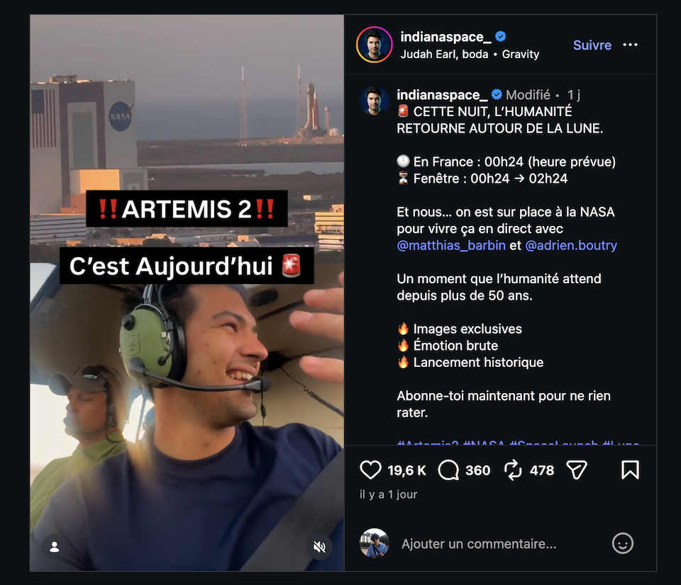 Le créateur de contenu Alexandre Griveau, connu en ligne sous le nom d’Indiana Space, a assisté le 1er avril en Floride au lancement d’Artemis II, première mission habitée autour de la Lune depuis 1972. Invité par la NASA, il doit en tirer un documentaire immersif.