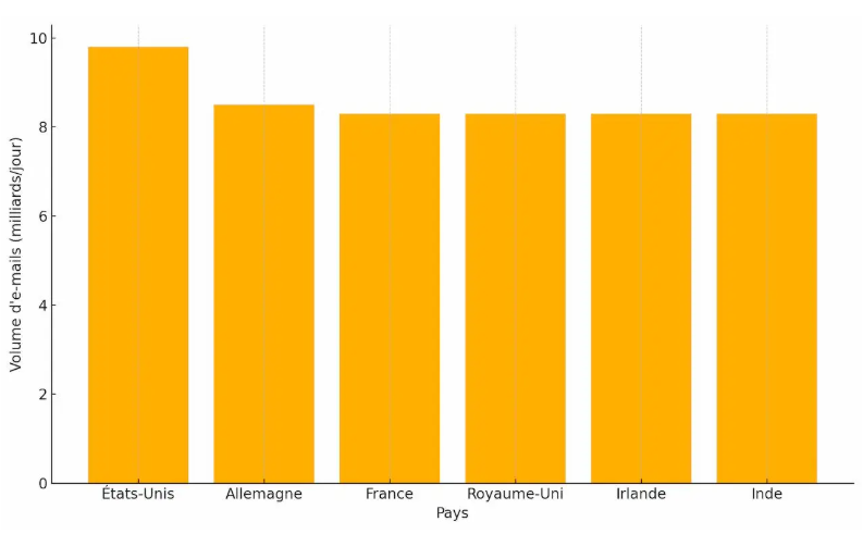 Chaque jour, près de 392 milliards de mails sont envoyés dans le monde, selon Statista. La France est le troisième plus important émetteurs de la planète avec 8,3 milliards de courriels diffusés quotidiennement.