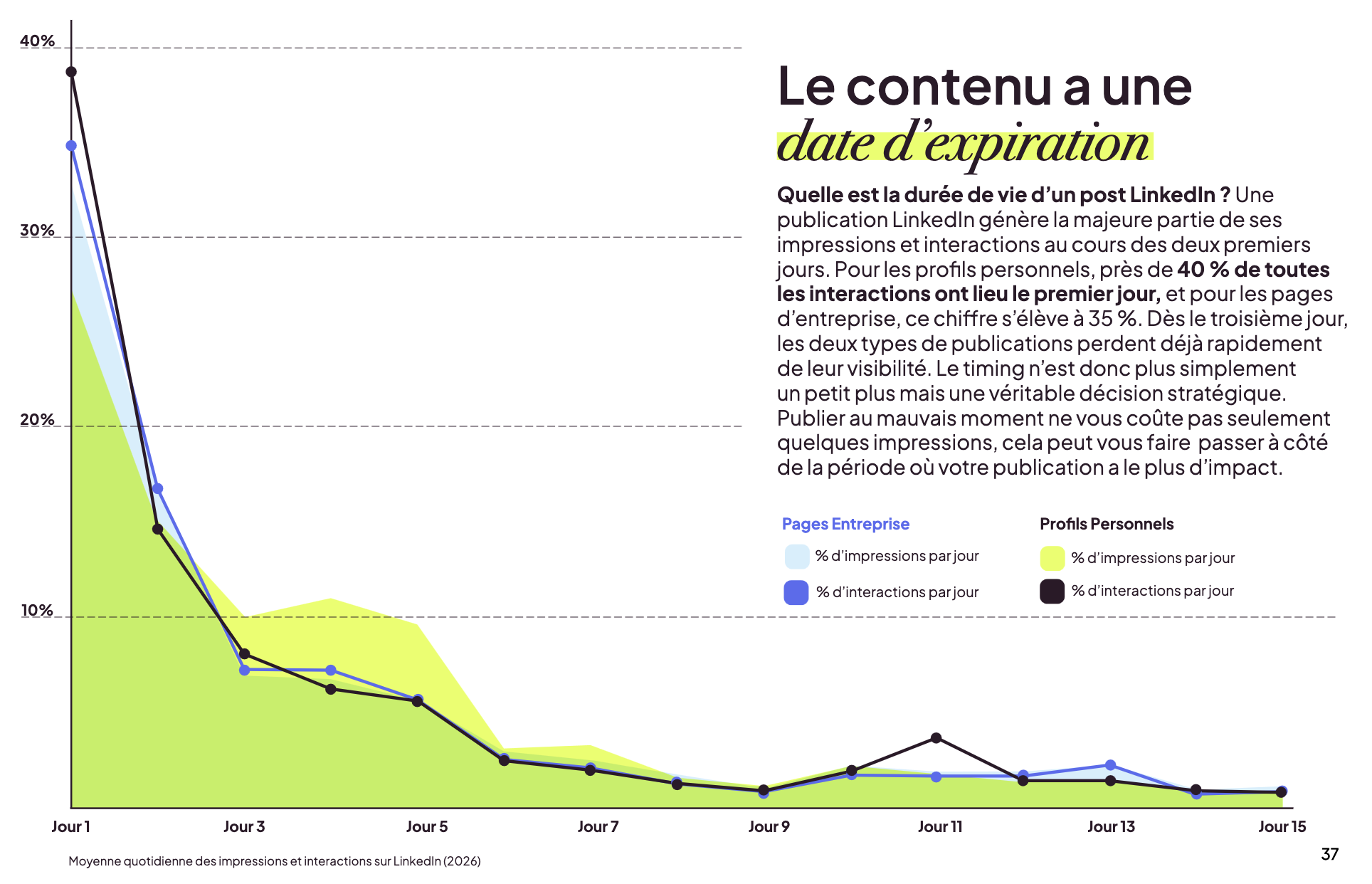 Le temps, lui aussi, devient un levier plus net. Un post LinkedIn génère la moitié de ses impressions dans les 48 premières heures. Sur les profils, 40 % des interactions arrivent dès le premier jour. Sur les pages, c’est 35 %. Le timing n’est donc plus un réglage secondaire, mais une variable stratégique à part entière.
