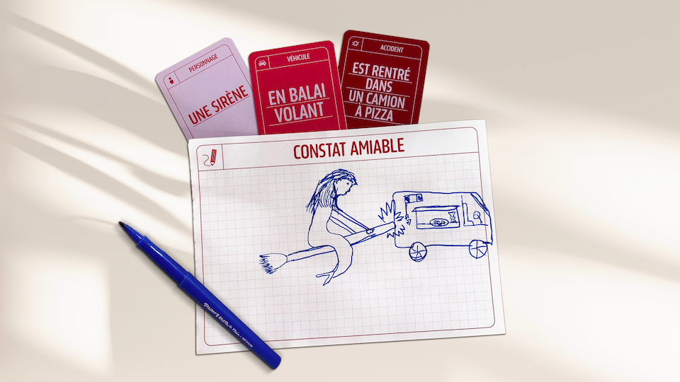 Le principe : tirer des cartes, inventer des accidents improbables, « Louis XIV au volant d’un camion à pizza a tamponné un quad », « une sirène en tapis volant a embouti une déneigeuse »… les dessiner, puis les faire deviner.
