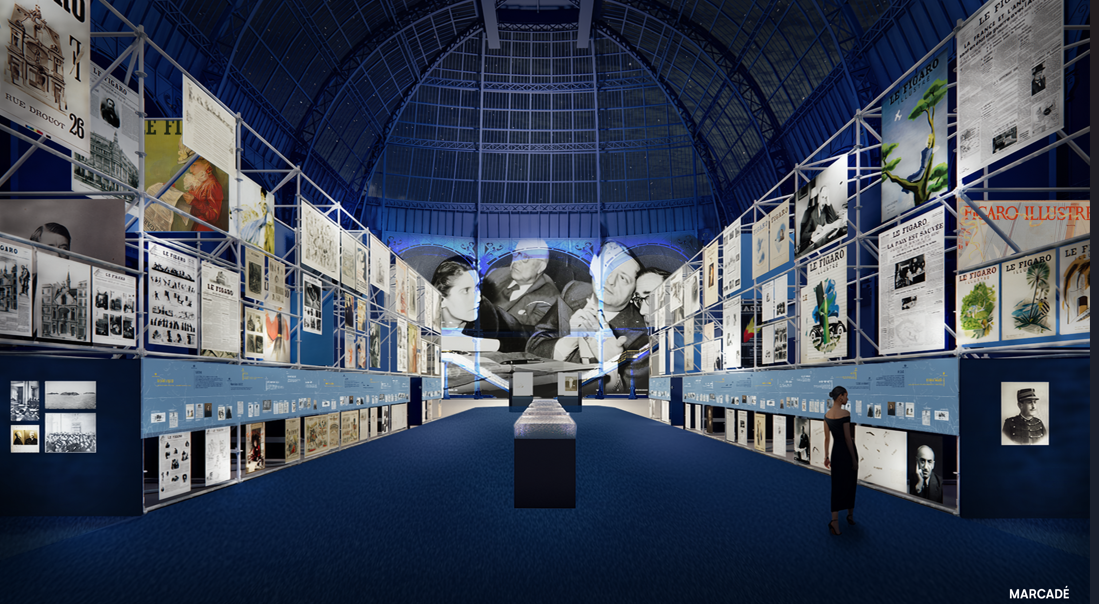 Claire Blandin : L’exposition présente plus de 300 documents issus des archives du Figaro, pour certains reproduits en très grand format et suspendus à six mètres de haut afin d’investir tout l’espace du Grand Palais. Ils ont été répartis dans quatre espaces correspondant à différentes époques du journal.