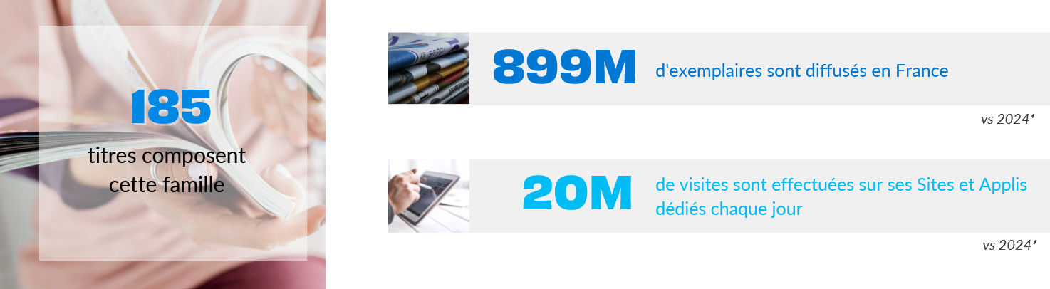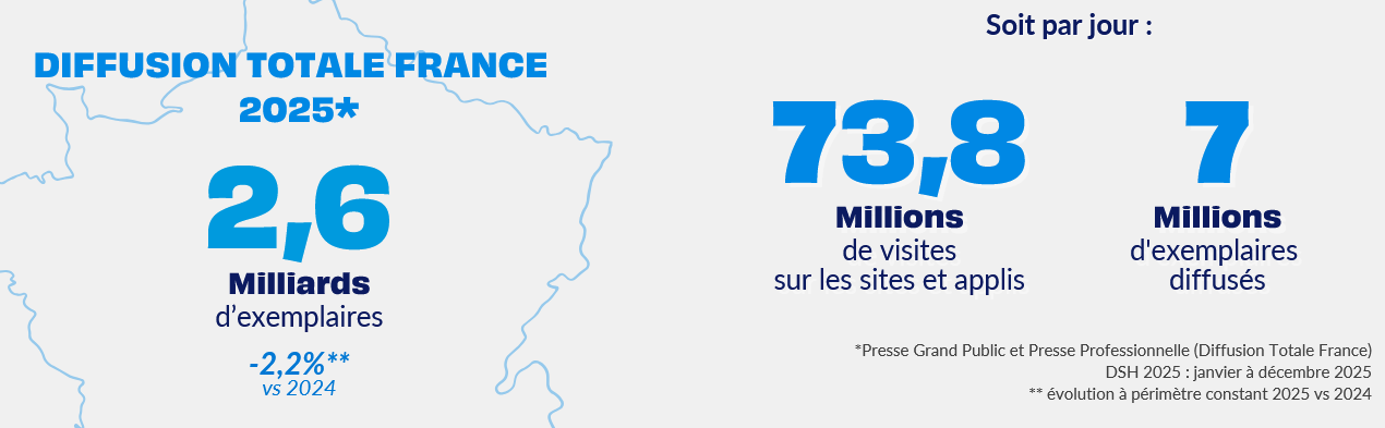– La presse grand public concentre l’essentiel des volumes avec une diffusion France payée (DFP) de 2,5 milliards d’exemplaires (-2,5 % contre -1,6 % en 2024).