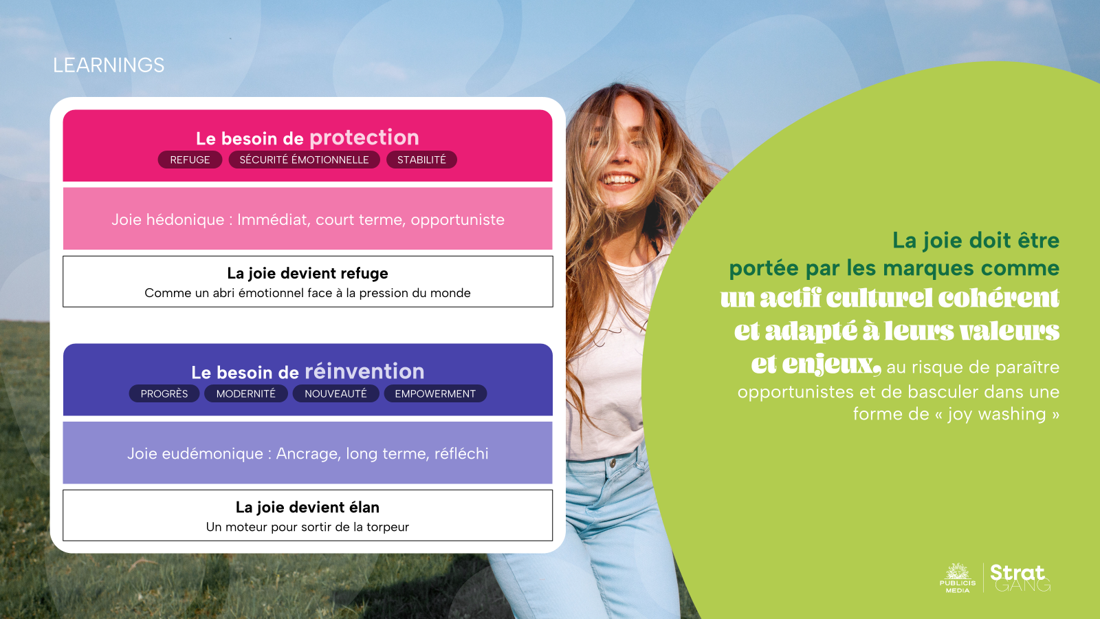 S’appuyant sur une veille stratégique, des analyses sociologiques et un benchmark international, l’étude montre comment la joie – hédonique ou eudémonique – dépasse le simple registre émotionnel pour devenir un véritable driver de business. Refuge face à la morosité ou élan vers la réinvention, elle s’impose comme l’émotion charnière capable de réconcilier protection et projection.