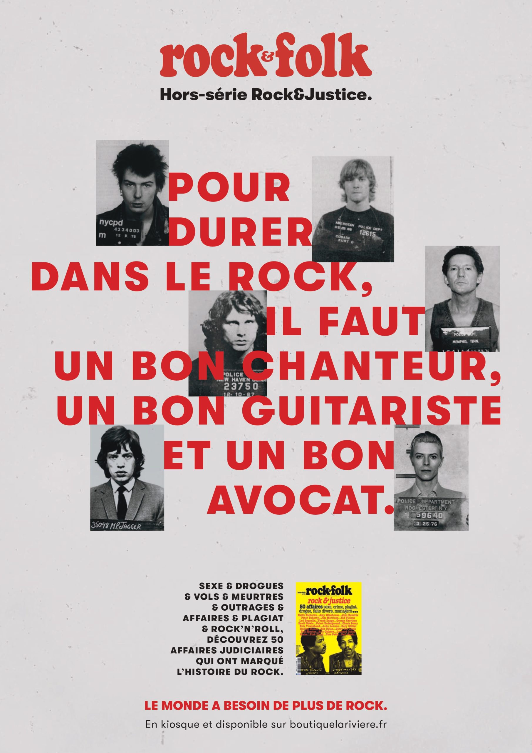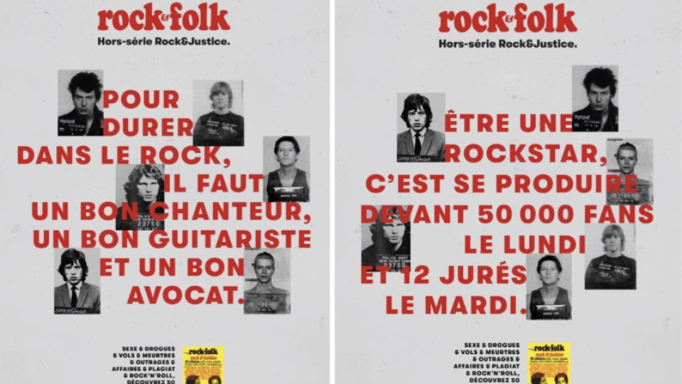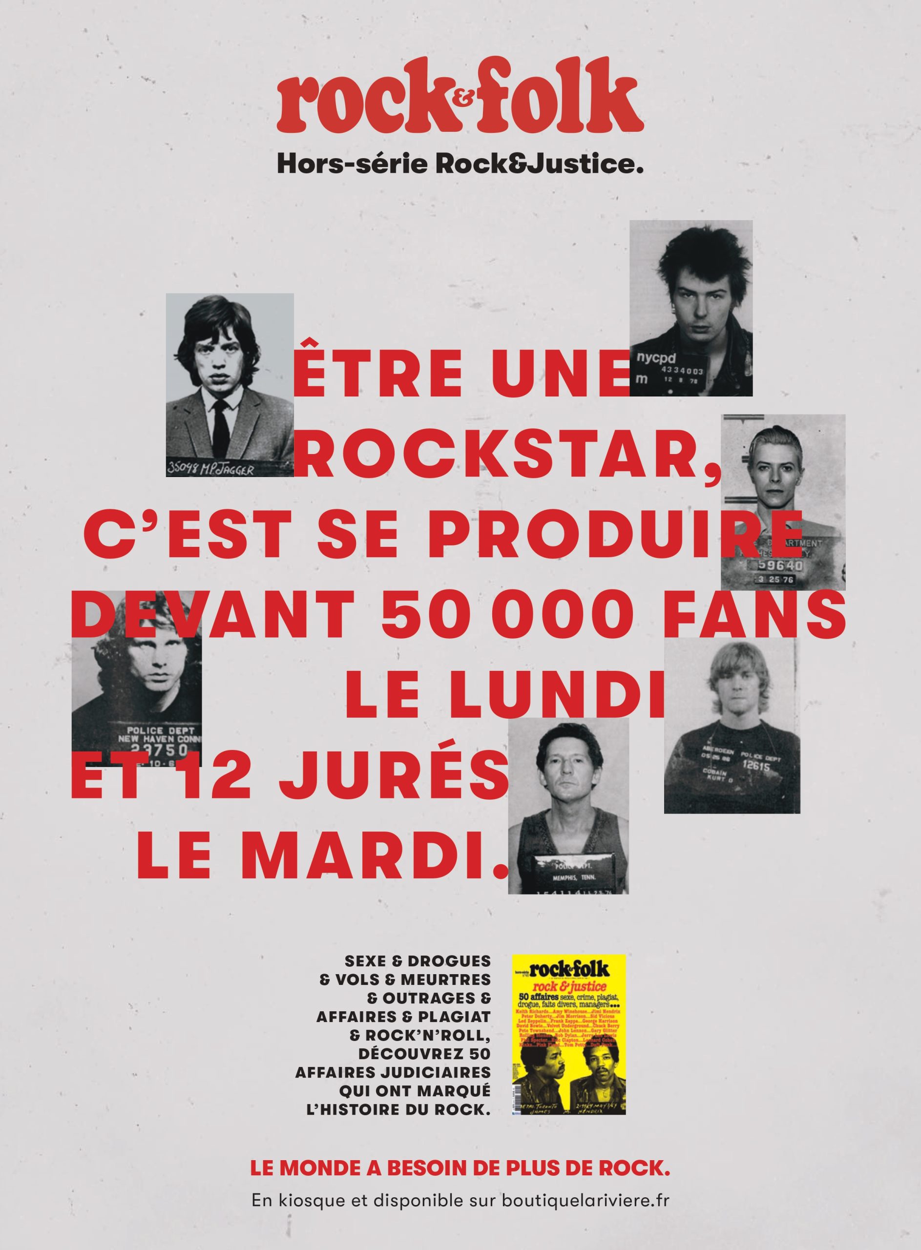 Pour accompagner la sortie de ce hors-série, BBDO Paris (ex-DDB) signe une campagne presse impertinente qui s’amuse de la rencontre du rock et de la justice à travers trois annonces inspirées des mythiques mugshots de légendes du genre.
