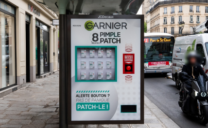 Garnier, JCDecaux et Publicis Media France transforment un Abribus parisien en distributeur de beauté pour lancer le Pimple Patch, une innovation anti-imperfections…