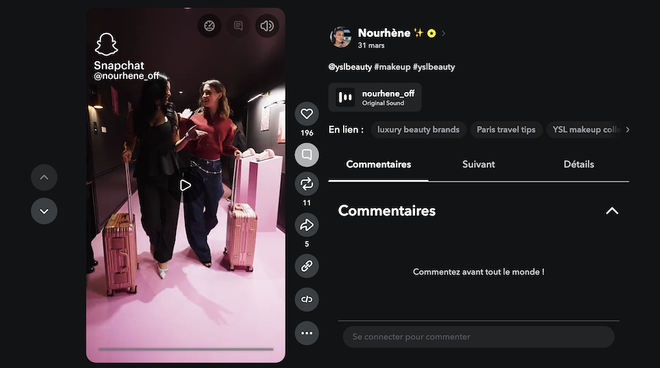 La marque réunit quatre Snap Stars, Nourhene, Mai Lee, Shana et Louise Rgt, dans un décor dédié, le « YSL Beauty Love Hotel », installé à l’Hôtel des Bains à Paris. L’idée est claire : construire un lancement d’abord pensé pour Snapchat, avec des créatrices dont la légitimité est directement liée à la plateforme.